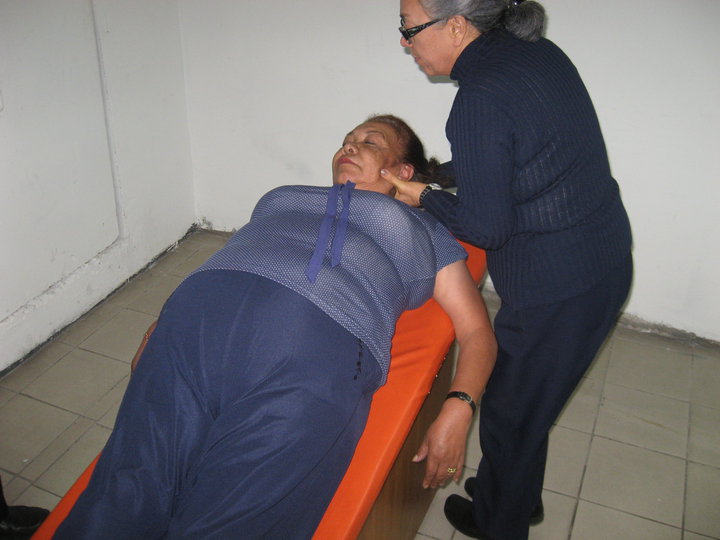 Se procede a la medición de la fuerza muscular en los dos brazos, por lo general, antes de la alineación, el paciente no podrá sustentar la contrafuerza,manifestando dolor y molestias en hombros y codos, ésta básica prueba es superada de forma "casi incrédula" por el paciente al ser repetida al final de la sesión.